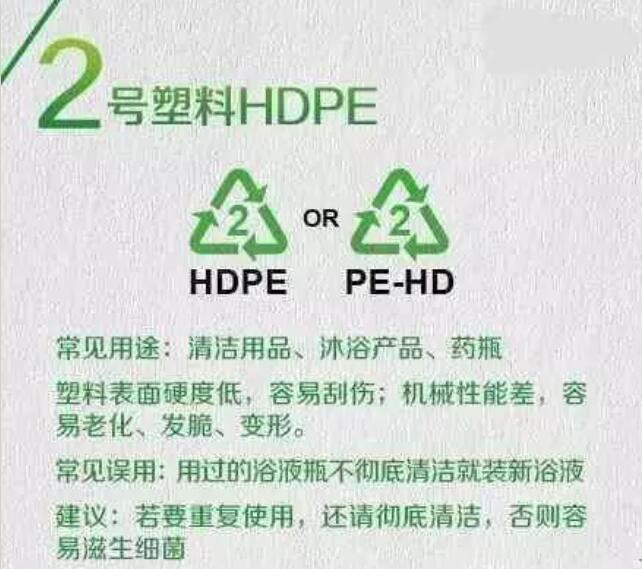 HDPE(高密度聚乙烯),清潔劑、洗發(fā)精、沐浴乳、食用油、農(nóng)藥等等的容器多以HDPE制造。容器多半不透明,手感似臘。